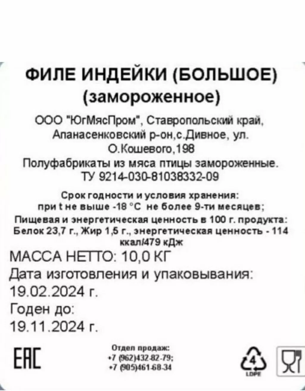 Филе грудки индейки (большое) 1/10 Юг Мяс Пром