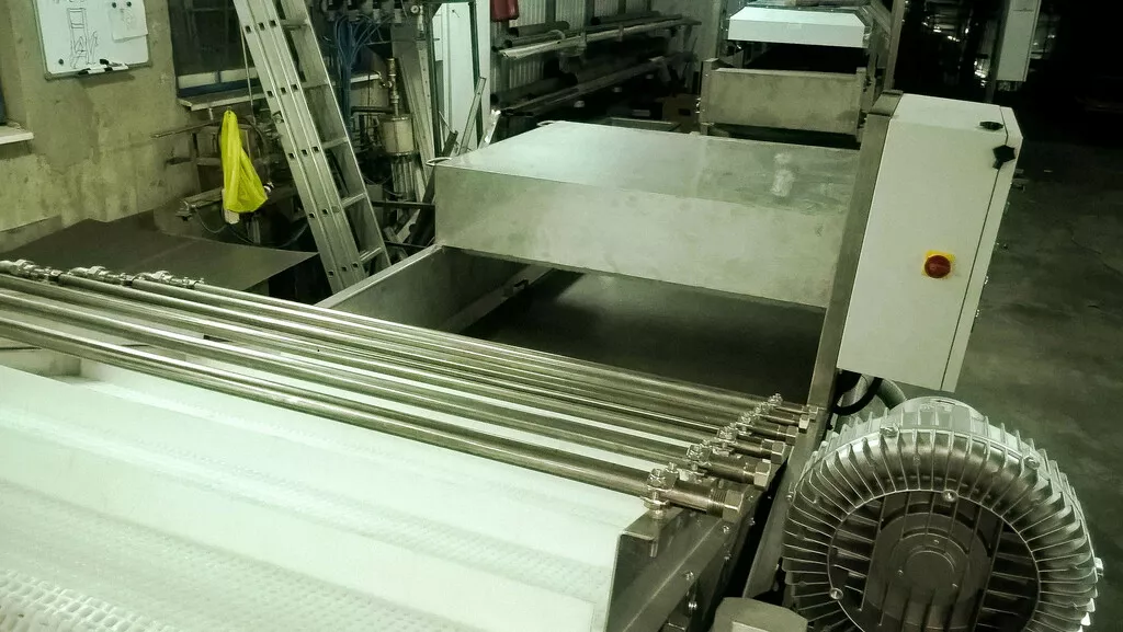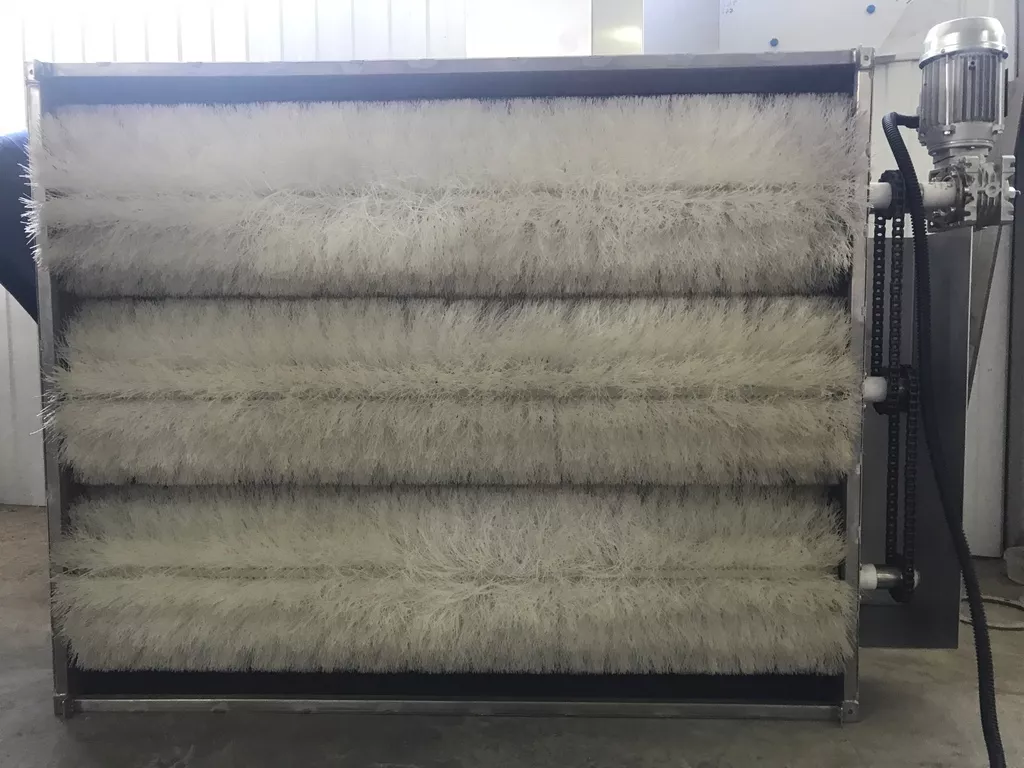 Для выгрузки продукта из ванны используется отводящий конвейер с модульной лентой. Попадая на конвейер продукт, омывается струями воды душирующего устройства, установленного над конвейером. После конвейера продукт поступает на следующую технологическую операцию. Мойка осуществляется за счет соприкосновения продукта друг с другом, с вращающимися щетками и барботирования воды воздухом.