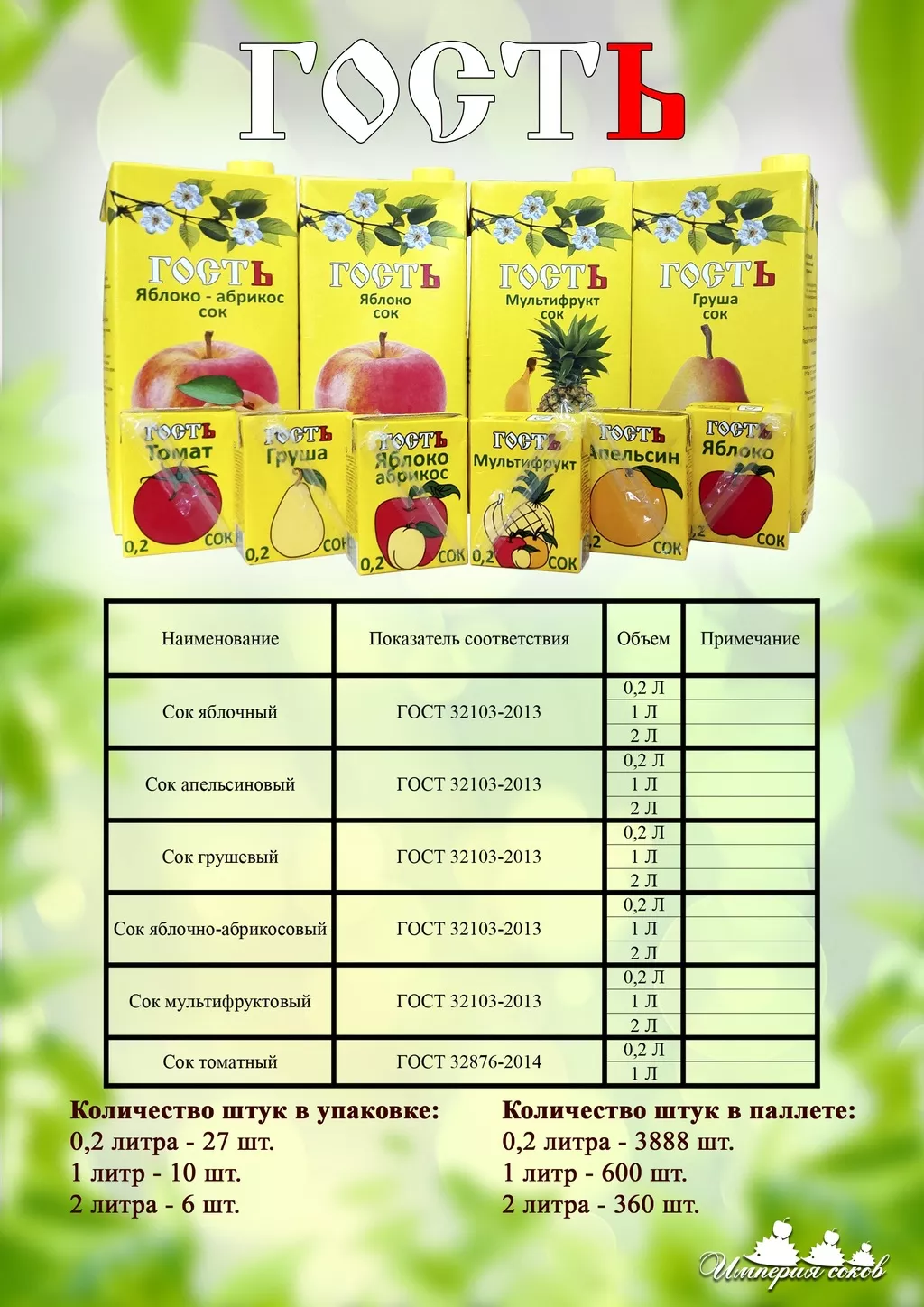 Предлагаю к продаже соки ТМ "ГОСТЬ" по Гост 32103-2013, 0,2л, 1л и 2л напрямую от производителя.